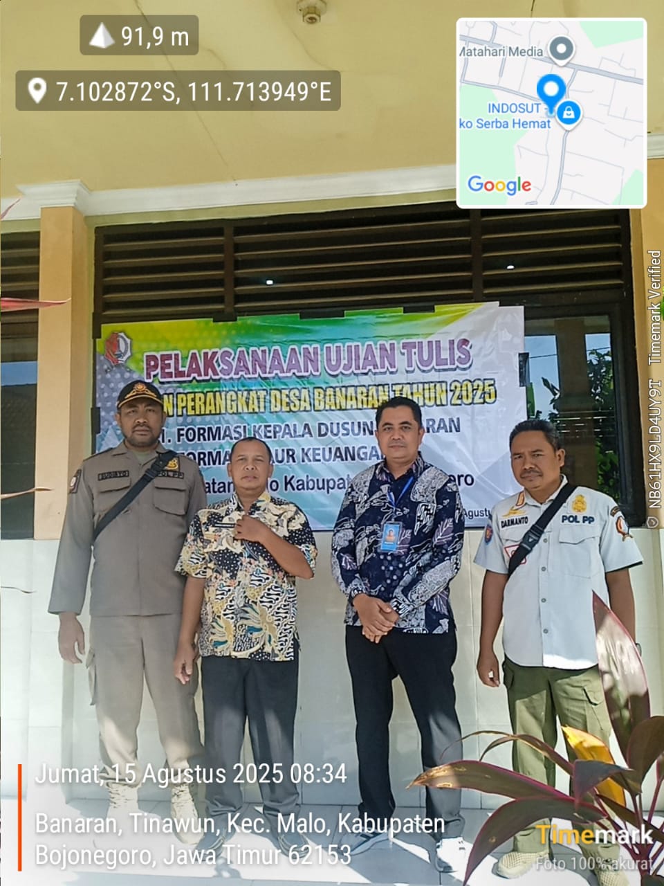 MALO – SDN Banaran, Kecamatan Malo, menjadi lokasi pelaksanaan ujian calon perangkat desa pada Jumat, 15 Agustus 2025, mulai pukul 08.00 WIB hingga selesai. Kegiatan ini dihadiri oleh Camat Malo, Kapolsek Malo beserta anggota, Babinsa Desa Banaran, Kepala Desa Banaran, serta Kasi Trantib dan anggota Satpol PP Kecamatan Malo. Pelaksanaan ujian berlangsung tertib dan lancar, dengan pengawasan ketat dari pihak terkait untuk memastikan proses berjalan sesuai prosedur.