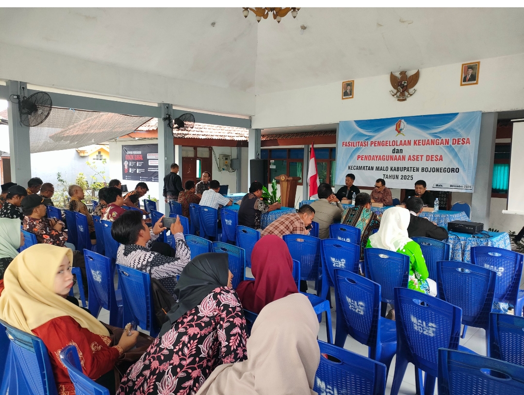 Pembinaan Pengelolaan Keuangan Desa dan Pendayagunaan Aset Desa tahun 2025 dengan Nara sumber Inspektorat Kabupaten Bojonegoro dan DPMD Kabupaten Bojonegoro yang di ikuti oleh kepala desa dan Bendahara Desa se-kecamatan Malo