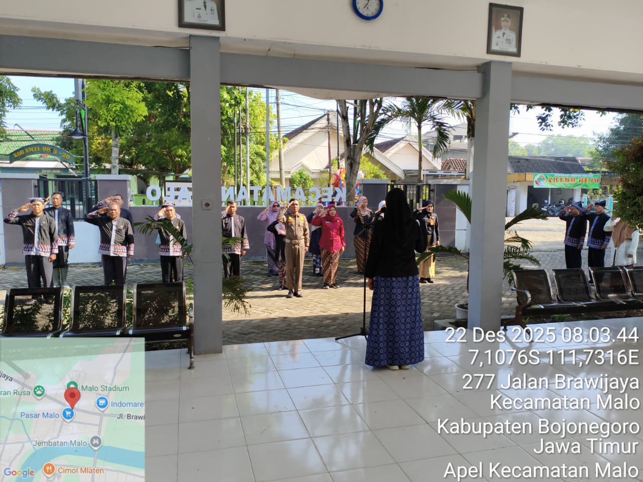 MALO – Pemerintah Kecamatan Malo melaksanakan kegiatan apel pagi rutin di halaman Kantor Kecamatan Malo pada Rabu, 22 Desember 2025, pukul 08.00 WIB, yang diikuti oleh karyawan dan karyawati serta seluruh dinas satu atap Kecamatan Malo, dengan dihadiri Camat Malo, Sekcam Malo, Kasi, Kasubag dan staf Kecamatan Malo, Koordinator Penyuluh Pertanian Malo beserta anggota PPL, Koordinator P3AKB Malo dan staf, Pendamping PKH, serta TKSK, dan kegiatan apel pagi tersebut berjalan dengan lancar, aman, dan terkendali.