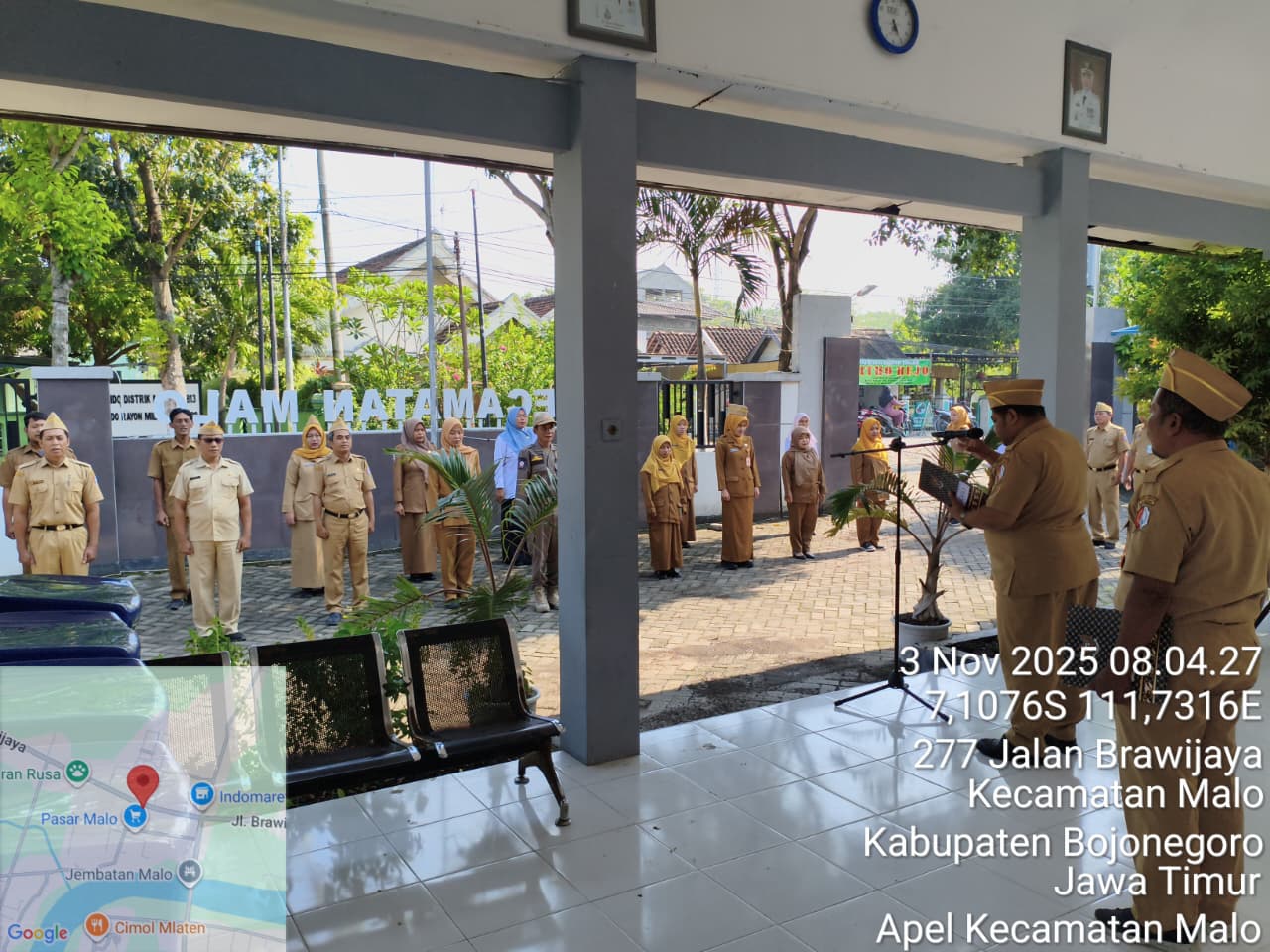 MALO- Apel pagi rutin kembali digelar di halaman Kantor Kecamatan Malo pada Senin (03/11/2025) dengan Camat Malo, Bapak Agus Saiful Aris, S.IP,...